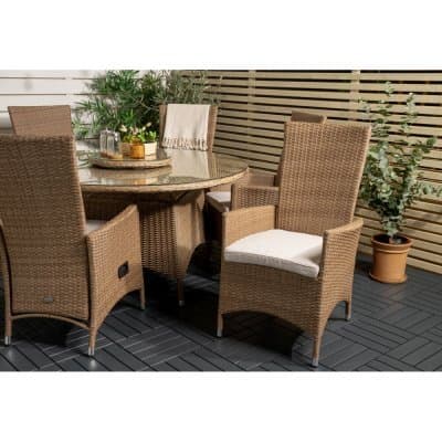 En ställbar/recliner-fåtölj med en stomme av aluminium, omgiven av vacker, naturfärgad konstrotting.