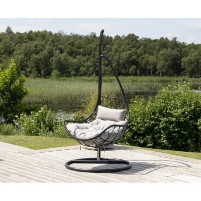 En hängstol med medföljande ställning som utlovar komfort. Här erbjuds mjuka, stoppade gråa dynor i 100% polyester, och slitstark, svart konstrotting.