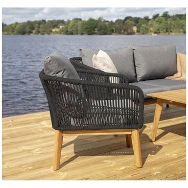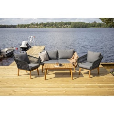 Klassisk lyx och design rubricerar denna fantastiska loungegrupp. Tillverkat i gediget akaciaträ och stål, tillsammans med följsamt, lindat rep som ger ett fantastiskt utseende och komfort.