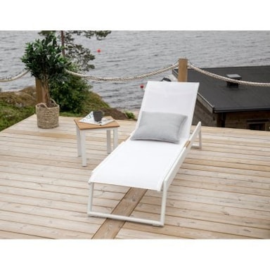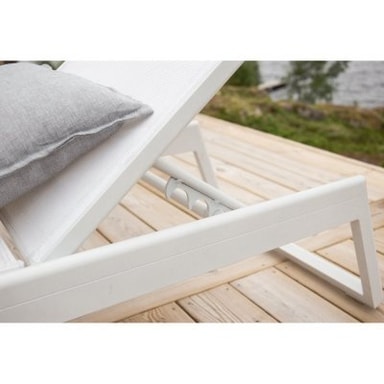 Slitstarkt likaså följsamt, vitt textilene vilar på en aluminiumstomme, med välvd huvud- och fotände. Inslag av teak på vardera sida sätter en säregen prägel solsängen, och avrundar det ljusa färgtemat.