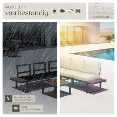 Den rymliga loungesoffan imponerar inte bara med sin eleganta design, utan också med sin höga stabilitet och hållbara konstruktion. Den robusta och väderbeständiga aluminiumramen gör loungegruppen perfekt anpassad för utomhusbruk, medan de höjdjusterbara skruvarna med golvskyddande och halkfria plastkåpor säkerställer en trygg stabilitet på alla underlag, oavsett om det är på en ojämn gräsmatta eller släta terrassplattor.