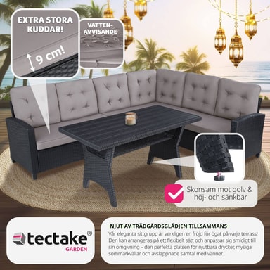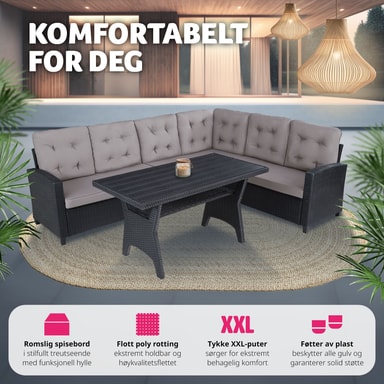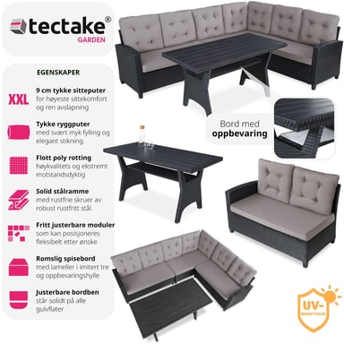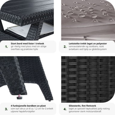 Tillverkat i UV-beständigt konstrotting och en robust stålram för långvarig hållbarhet. Kuddarnas vattenavvisande överdrag är avtagbara och enkla att tvätta, vilket gör setet perfekt för alla väderförhållanden.