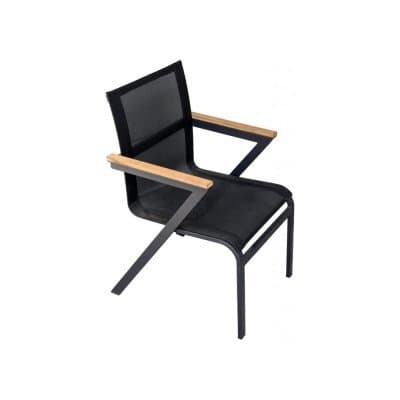 Svart aluminium utgör en stomme som är klädd i slittålig, likväl behaglig, textilene. Armstöd i skarpa konturer med inslag av teak.