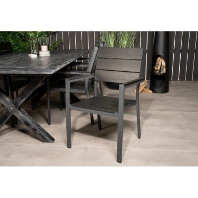 En svart stomme i aluminium förenas med sits, armstöd och ryggstöd i matchande nyans, av det slittåliga materialet aintwood.