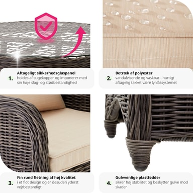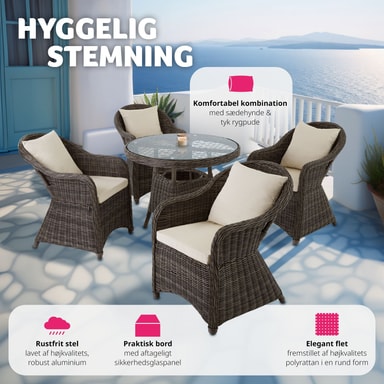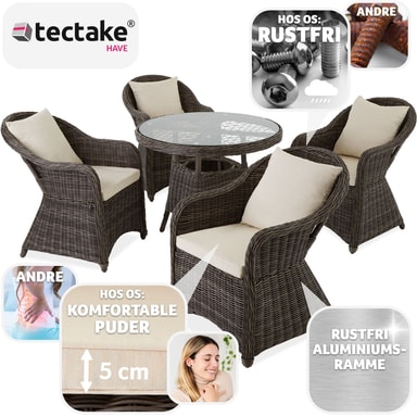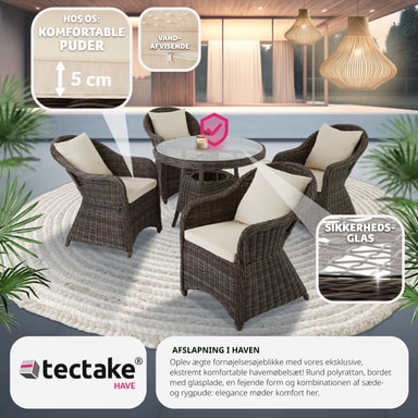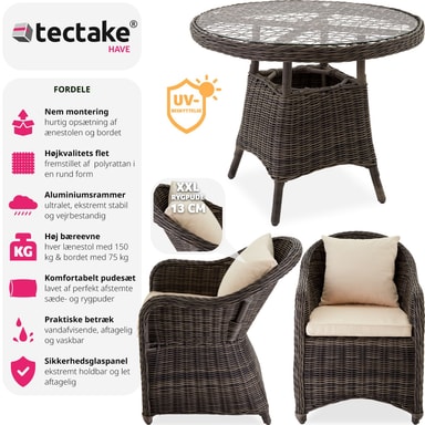 Denna vackra möbelgrupp i konstrotting blir ett blickfång hemma i din trädgård, på terrassen eller balkongen. Tack vare ramen i väderbeständigt aluminium är dessa stolar extra lätta. Bordet är väl anpassat i höjd till fåtöljerna och står stabilt. Glasskivan ligger tack vare sugkoppar glidskyddat på det runda bordet. Denna möbelgrupp, med sina imiterade färgskiftningar, skiljer sig inte visuellt från en naturväv. Den mjuka sittdynan och ryggkudden är mycket bekväm och dessutom vattenavvisande. Ge din trädgård ett lyxigt inslag med trädgårdsmöbler från tectake., Köp hem möbelgruppen idag.