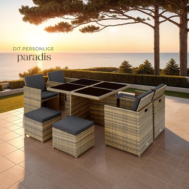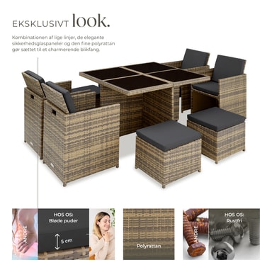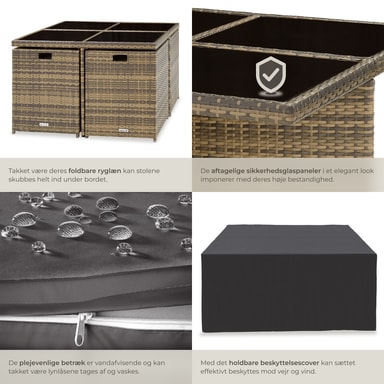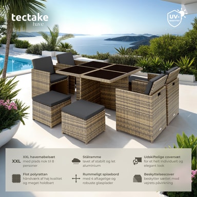 Oavsett om matgruppen Manhattan används i trädgården, på terrassen, i uterummet eller i vardagsrummet så ger de eleganta möblerna i slitstark konstrotting och aluminium ett inslag av stilren design och hög funktionalitet. De bekväma trädgårdsstolarna och det eleganta bordet skapar en inbjudande atmosfär för trevliga stunder, både inomhus och utomhus. Vår matgrupp är inte bara elegant utan också mycket hållbar med en lång livslängd. Den låga vikten gör det bekvämt att transportera och enkelt placera trädgårdsmöblerna där de behövs. Bordsytan i glas med 4 delsegment ger ett stiligt intryck och är mycket enkel att rengöra för minimal ansträngning. De bekväma sittkuddarna är skyddade av praktiska polyesteröverdrag med dragkedja och är noggrant färgkoordinerade för att harmonisera perfekt med konstrottingen. För att skydda dynorna från genomfuktning är ytan impregnerad, vilket gör att smuts- och vattendroppar rinner av och håller möblerna fräscha länge. Slappna av och njut av en middag utomhus eller en avkopplande stund med dina nära och kära i loungegruppen Manhattan från tectake.