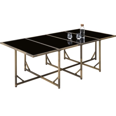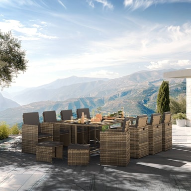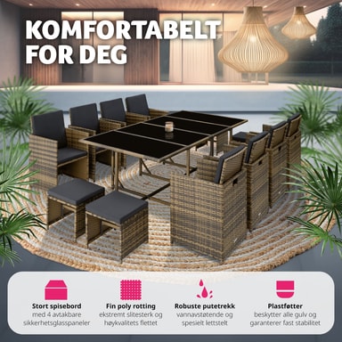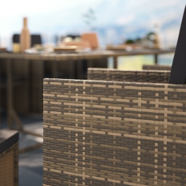 Njut av oförglömliga stunder utomhus med vår exklusiva loungegrupp Palma i konstrotting. Denna stiliga matgrupp erbjuder plats för 8 till 12 personer och är det perfekta valet för födelsedagar, familjeträffar eller festligheter. Tack vare sin smarta och platsbesparande design kan utemöblerna förvaras praktiskt genom att stolarna med sina fällbara ryggstöd, enkelt skjuts in helt under bordet. De praktiska handtagen på baksidan gör denna manöver ännu enklare och mer bekväm.