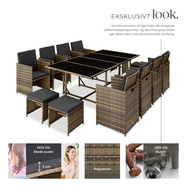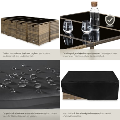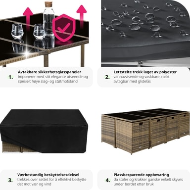 Mittpunkten i detta loungeset är det rymliga bordet med fyra lfyra lättskötta skivor av säkerhetsglas, som erbjuder gott om plats för en trevlig måltid utomhus. Sitt- och ryggdynornas överdrag är avtagbara och vattenavvisande och kan tack vare den praktiska dragkedjan, enkelt tas av och tvättas. Dynornas färger är noggrant anpassade till konstrottingen, vilket ger setet ett stilrent och harmoniskt utseende – perfekt för både avkoppling och sociala stunder i trädgården.