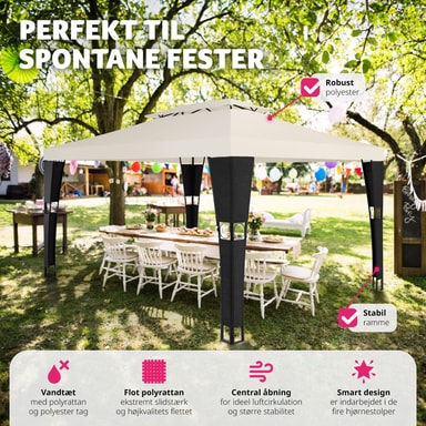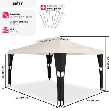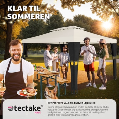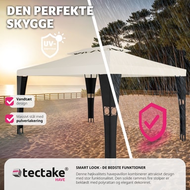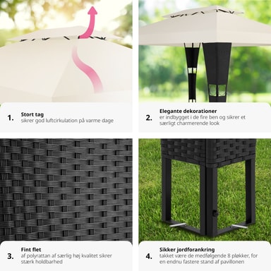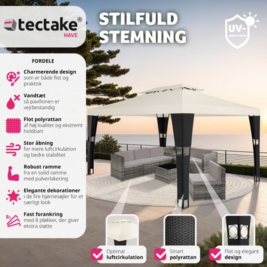 Förvandla din trädgård till en må bra-oas med vår paviljong i konstrotting från tectake. Njut av varma dagar, ljumma sommarkvällar och trevliga trädgårdsfester under detta skuggande och vattenavvisande tak på din paviljong. Det släpper ut värme och låter frisk luft cirkulera på ett optimalt sätt. Den pulverlackerade stålramen är klädd med konstrotting och dekorerad med vackra ornament. Trolla fram en aning sydländsk flärd i din trädgård med den vackra paviljong i konstrotting från tectake.