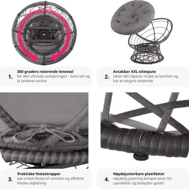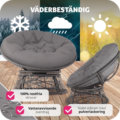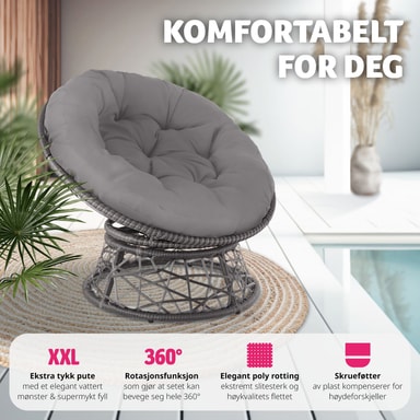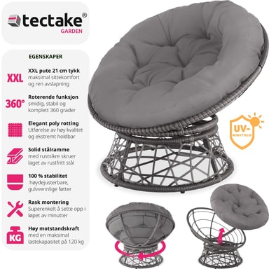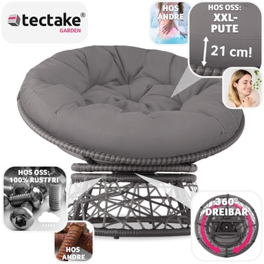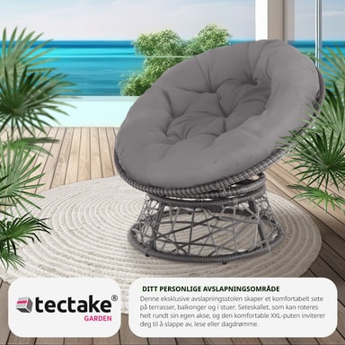 Denna svängda rottingfåtölj från tectake har en design med härlig sittkomfort. Den stora, tjocka och runda kudden formar sig runt kroppen och gör att du sitter väldigt bekvämt. Denna rottingfåtölj har en robust ställning av pulverlackerat stål som kan vridas komplett runt den egna axeln och ger konstruktionen stor stabilitet, samt gör att den tål hög belastning. På ojämnt underlag kan de 6 plastfötterna enkelt höjdjusteras - således skapar denna inbjudande fåtölj en mycket behaglig atmosfär.
