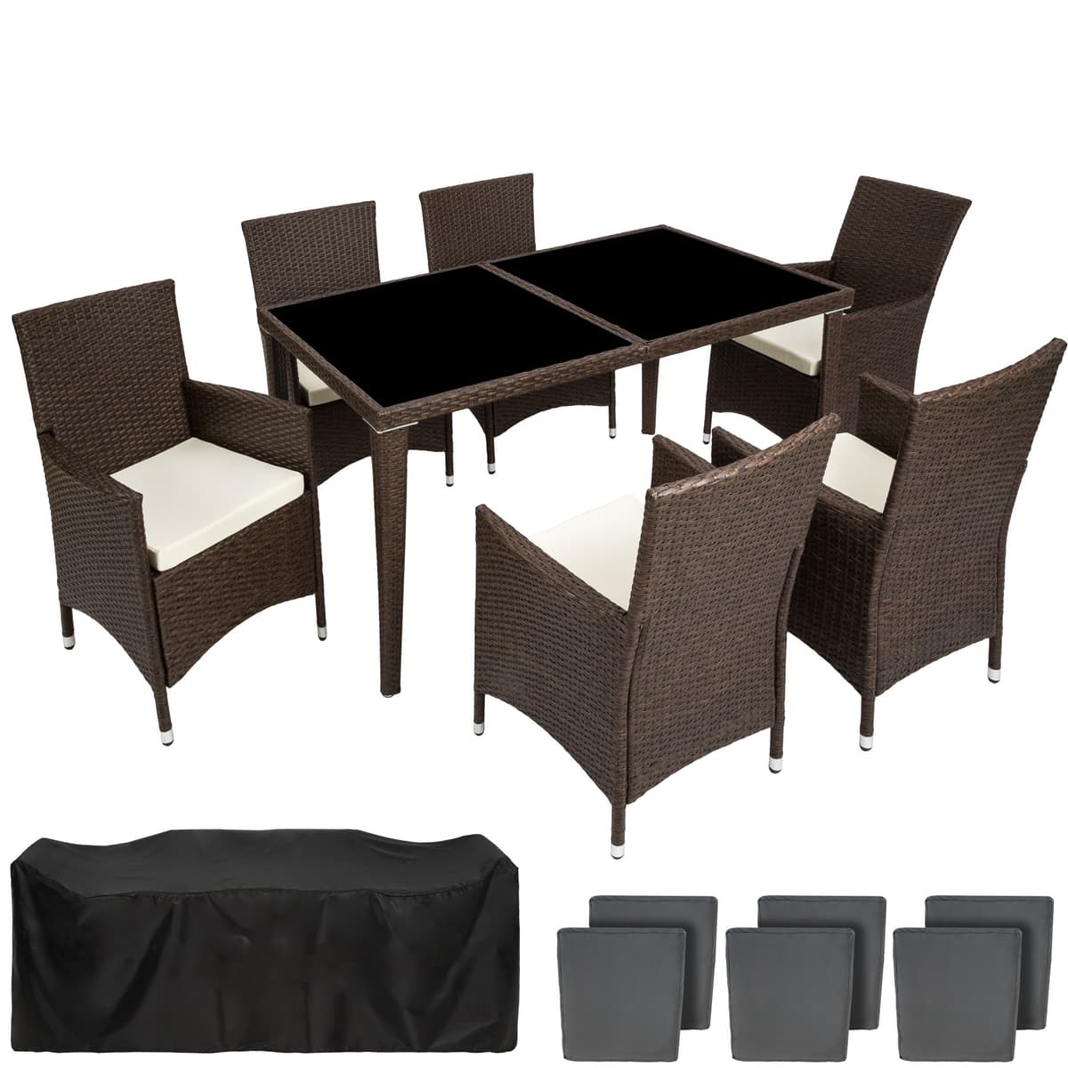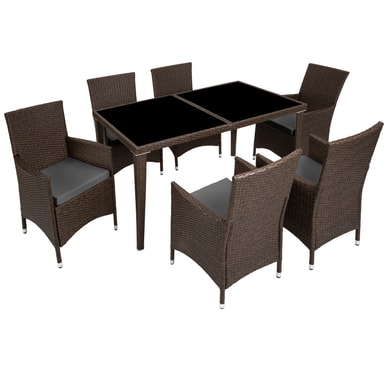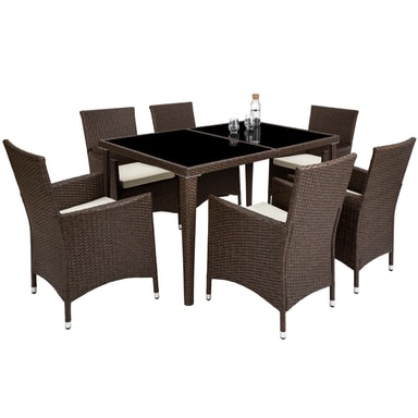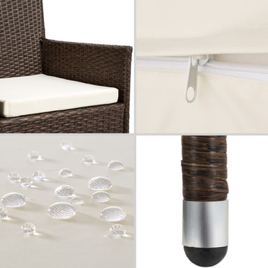 Oavsett om er nya sittgrupp ska användas i trädgården eller inomhus: Våra konstrottingmöbler kan användas flexibelt och lyfter din trädgård, terrass, uterum eller vardagsrum. De bekväma stolarna och det eleganta bordet inbjuder till trevliga stunder. Vår sittgrupp är inte bara elegant utan imponerar även genom sin långa livslängd. Den låga vikten gör det bekvämt att transportera möblerna. Bordsytan i glas med två sektioner gör ett mycket elegant intryck och är extremt lättrengjord. De mycket bekväma gräddfärgade sittkuddarna i polyester är väl färgkombinerade med konstrottingen och har dragkedja på baksidan för enkel rengöring av överdragen. För att skydda dynan från genomfuktning är ytan impregnerad. På så sätt rinner smuts- och vattendroppar helt enkelt av. Prioritera glädje och samhörighet med en matgrupp från Tectake.
