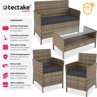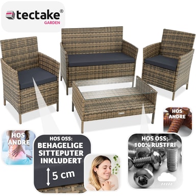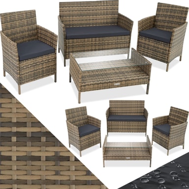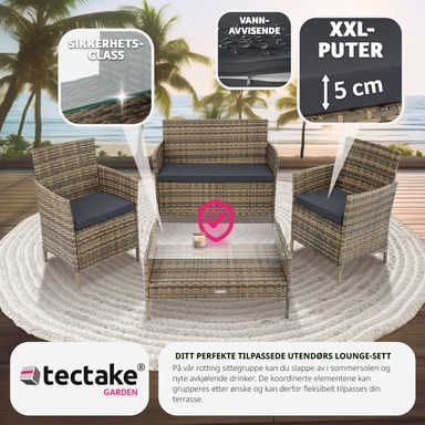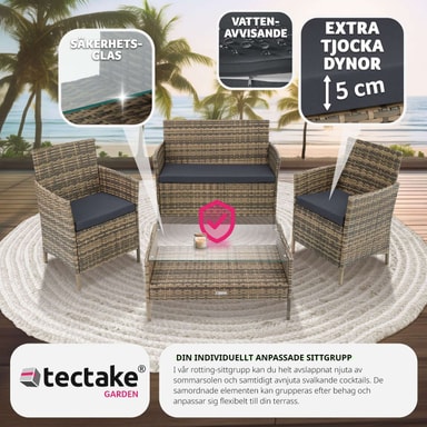 Komplettera din utomhusoas med vår stiliga soffgrupp rattan_sittgrupper, som erbjuder en modern och snygg design. Denna hållbara och robusta sittgrupp är perfekt för avkopplande stunder i din trädgård eller på din balkong. Sittgruppen består av en bekväm sittbänk med avtagbar sittdyna och ett funktionellt bord med avtagbar glasskiva. Den erbjuder plats för upp till fyra personer och inbjuder till medelhavskvällar i bästa sällskap.