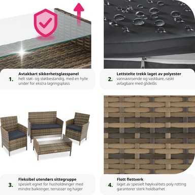 Soffgrupp rattan_sittgrupper kommer med ett praktiskt bord som erbjuder gott om plats för mat, dryck, böcker och mer. Med måtten ca 85 x 46 x 41,5 cm och en extra förvaringsyta under glasskivan är dina favoritföremål alltid inom räckhåll. Oavsett om du läser en bok, lyssnar på radio eller bara njuter av sällskapet – denna soffgrupp erbjuder den perfekta bakgrunden.