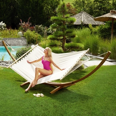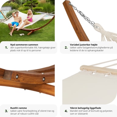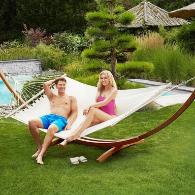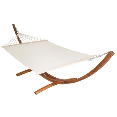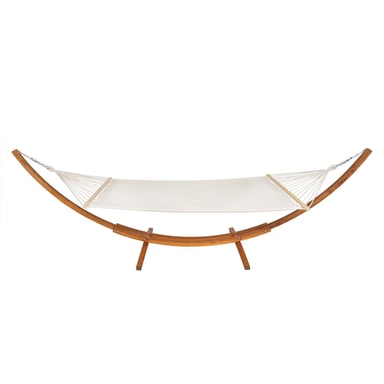 Vår hängmatta kommer med ett imponerande trästativ, som inte bara är en visuell höjdpunkt utan säkerställer också en hög stabilitet. Den rundade, eleganta formen av stativet är tillverkat av noggrant bearbetat lärkträ, vilket ger en hög densitet och imponerande stabilitet. Detta material är kapabelt att stödja upp till 200 kg utan problem, vilket säkerställer att din hängmattaupplevelse är både säker och bekväm.