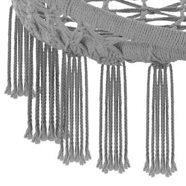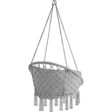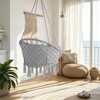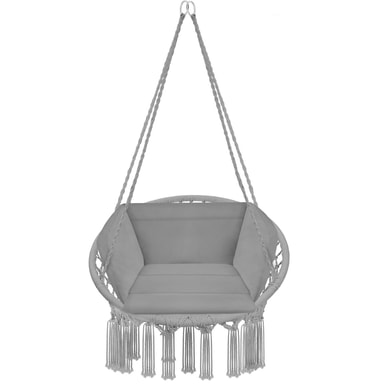 Sväva lugnt ovanför all vardagsstress i denna eleganta och bekväma hängstol och hänggunga från tectake. Den supermjuka dynan och det fina flätade bomullsmaterialet med dekorativa prydnadstofsar anpassar sig perfekt efter din kropp och säkerställer att du sitter bekvämt i hängstolen. Trots den låga vikten är konstruktionen av pulverlackerat stål, polyester och bomull ytterst stabil och robust. När denna hängstol inte används kan den enkelt plockas undan och lätt tas med överallt. Njut av en spännande bok eller ett glas gott vin i vår hängstol.
