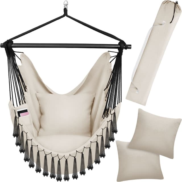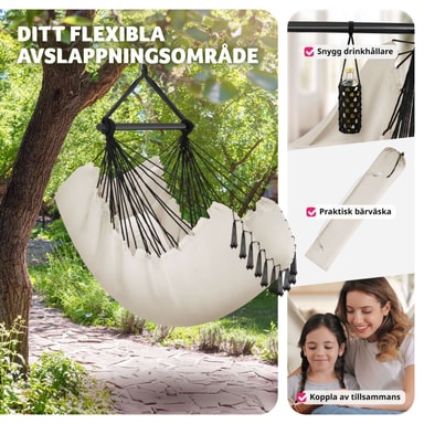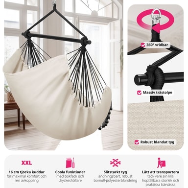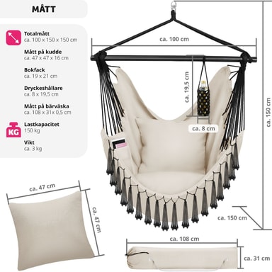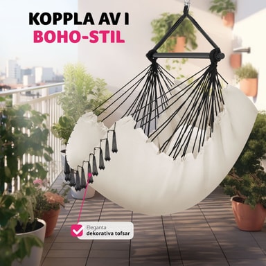 Utforska konsten att koppla av med den bekväma hängstolen Malika från tectake. Med extra tjocka sitt- och ryggkuddar kan du gunga dig till total avslappning. Den fullt roterbara hängstolen i modern boho-stil kommer med långa prydnadsfransar och har även en praktisk bokhylla och en makramé-dryckeshållare, vilket gör den perfekt för att ha läsning och en svalkande dryck nära till hands. Den belastningsbara hängstolen, som tål upp till 150 kg, hängs upp på en stabil trästolpe med sidokanter med antiglidspår. Dessutom medföljer en praktisk bärkasse för enkel transport och förvaring. Med den ultrakomfortabla Malika-hängstolen kan du skapa en mysig hörna i ditt vardagsrum, på balkongen eller ute på terrassen. Upplev konsten att koppla av med en hängstol som passar både inomhus och utomhus och som är perfekt för trädgården eller utomhusbruk.
