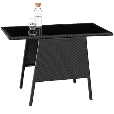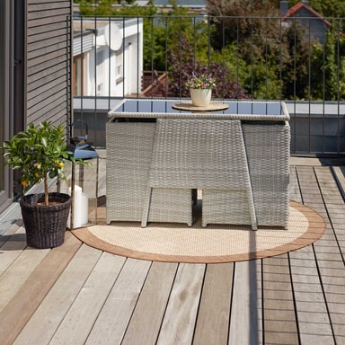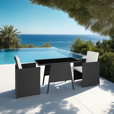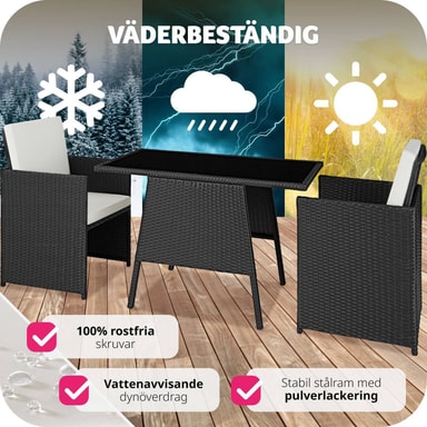 Denna kompakta matgrupp i konstrotting från tectake är perfekt för uteplatser med mindre utrymme. Trädgårdsmöbeln är funktionellt designad utan att kompromissa med komfort och stil. Den flätade konstrottingen har en elegant struktur, medan ramen är byggd av robust och pulverlackerat stål för hög hållbarhet och stabilitet. Utemöblernas kompakta design gör att de separata elementen kan enkelt skjutas ihop och förvaras platsbesparande. Trädgårdsmöbelns fåtöljer erbjuder hög komfort, med mjuka dynor och avtagbara dynöverdrag som enkelt kan rengöras. Perfekt för avkoppling på tu man hand – vår inbjudande loungegrupp Lausanne från tectake.