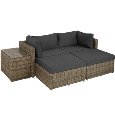 Detta eleganta loungeset i konstrotting från tectake ger hög komfort och passar utmärkt för en stunds avkoppling och småprat i det fria. De enskilda elementen i loungegruppen kan grupperas om helt efter dina önskemål och ger ditt hem en personlig känsla. Bestäm exempelvis om loungesetet ska bestå av två divaner med bord i mitten eller om det passar bättre som soffa och sittpallar - möjligheterna är många! Bordet har en avtagbar glasskiva och fåtöljerna och pallarna har vattenavvisande dynor. De ingående delarna i denna soffgrupp levereras färdigmonterade. Loungesetet passar perfekt som utemöbel tack vare det flätade materialet av slitstark konstrotting och den stabila ramen av aluminium.