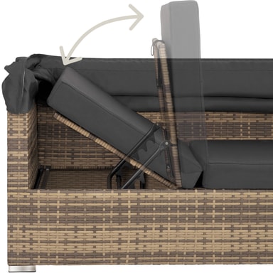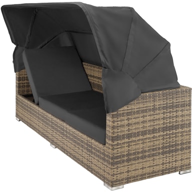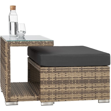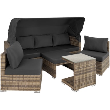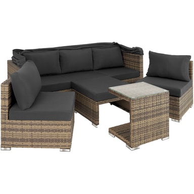 Det inbjudande loungesetet från tectake med mjuk stoppning, hopfällbart parasoll och justerbart ryggstöd gör loungesetet mångsidigt. Loungesetet erbjuder optimal avkoppling och en perfekt plats för umgänge. De enskilda modulerna i det stora setet kan omgrupperas helt efter din smak och ger ditt hem en personlig touch. Både soffan, fåtöljerna, pallen med vattenavvisande kuddar och det skjutbara bordet levereras färdigmonterade. Det slitstarka konstrottingen ger ett högkvalitativt intryck, och den stabila aluminiumramen gör detta lättskötta loungeset från tectake till ett utmärkt val för utemiljöer.