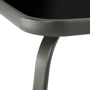 Sittgruppens sidobord imponerar med sin slag- och stöttåliga skiva av säkerhetsglas. Den lättskötta ytan är idealisk för daglig användning utomhus, oavsett om det är kaffekopp eller dekoration – här hittar allt sin plats.