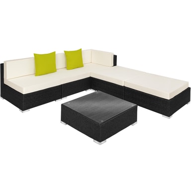 Oavsett om det är i trädgården eller inomhus är vår rottingloungegrupp Paris mångsidig och kommer att förbättra utseendet på din trädgård, uteplats, uterum eller vardagsrum. Bekväma fåtöljer och ett elegant bord inbjuder dig att tillbringa avkopplande timmar. Denna loungegrupp imponerar inte bara med sitt eleganta utseende utan också med sin långa livslängd. Den lätta designen gör möblerna enkla att flytta. Glasbordsskivan har ett sofistikerat utseende och är lätt att rengöra. De mycket bekväma sittdynorna i polyester är perfekt färgkoordinerade med rottinggruppen och har dragkedjor på baksidan för enkel rengöring av överdragen. Dynornas yta är impregnerad för att skydda dem från fukt, så att smuts och vattendroppar enkelt pärlar av. De olika individuella elementen gör att du kan arrangera gruppen efter dina önskemål. Denna rottingloungegrupp är idealisk som trädgårds- eller balkongmöbler.