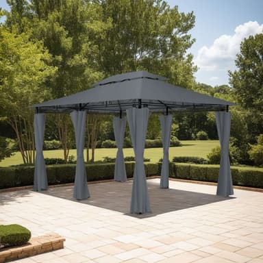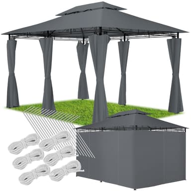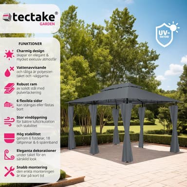 Upplev lyxen av en trädgårdspaviljong som kombinerar elegans och funktionalitet på ett oslagbart sätt. Vår paviljong, utrustad med avtagbara sidoväggar och UV-beständigt material, är den perfekta lösningen för att skapa en avkopplande och skyddad plats i din trädgård. Denna paviljong är inte bara ett blickfång utan också en investering i komfort och skydd.
