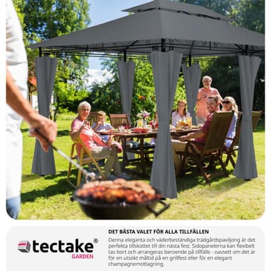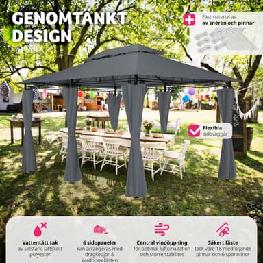 Oavsett om du planerar en trädgårdsfest eller bara vill ha en lugn plats för avkoppling, vår paviljong passar alla dina behov. Med en täckningsyta på cirka 12 kvadratmeter finns det gott om utrymme för alla dina utomhusmöbler och gäster. Denna paviljong är inte bara en praktisk lösning utan också en elegant tillägg till din trädgård.