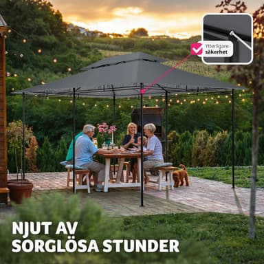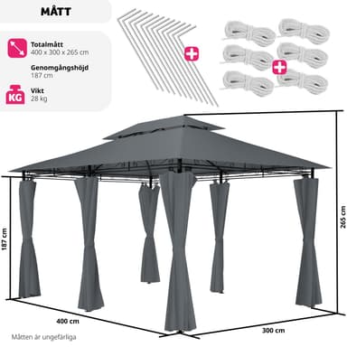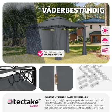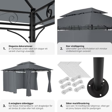 Med en robust ram av pulverlackerat stål och stabila markfästen, garanterar denna paviljong en lång livslängd och säkerhet. De medföljande spännlinorna och markpinnarna säkerställer att paviljongen står stadigt även under tuffa väderförhållanden. Ornamentverzieringarna ger en extra touch av lyx, vilket gör denna trädgårdspaviljong till en utmärkt plats för att underhålla gäster eller för att bara koppla av.