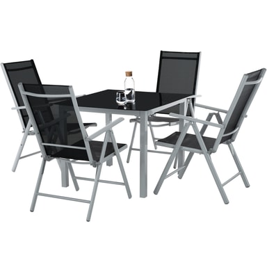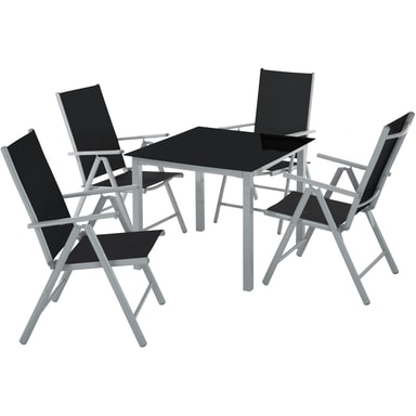 Denna eleganta och stabila matgrupp i aluminium med 4 stolar blir perfekta utemöbler till den härliga svenska sommaren. Ett tåligt och stabilt matbord med slitstark glasskiva och aluminiumställning har plats för många gäster och garanterar hög komfort för alla. Med detta bord medföljer 4 lutningsbara, hopfällbara stolar av robust, men mycket lätt aluminium. Dessutom har dessa stolar höga ryggstöd för bättre sittkomfort. Ditt hem och uteplats förtjänar en sittgrupp av klass! Få inspiration till mysiga middagar på sommarkvällarna, med denna mångsidiga matgrupp från tectake.