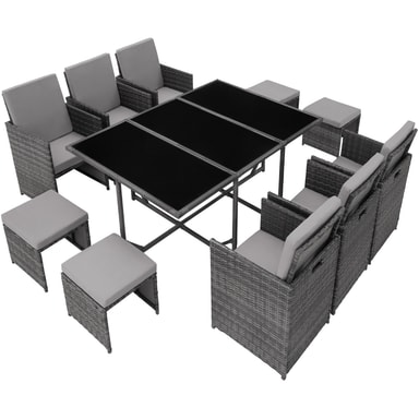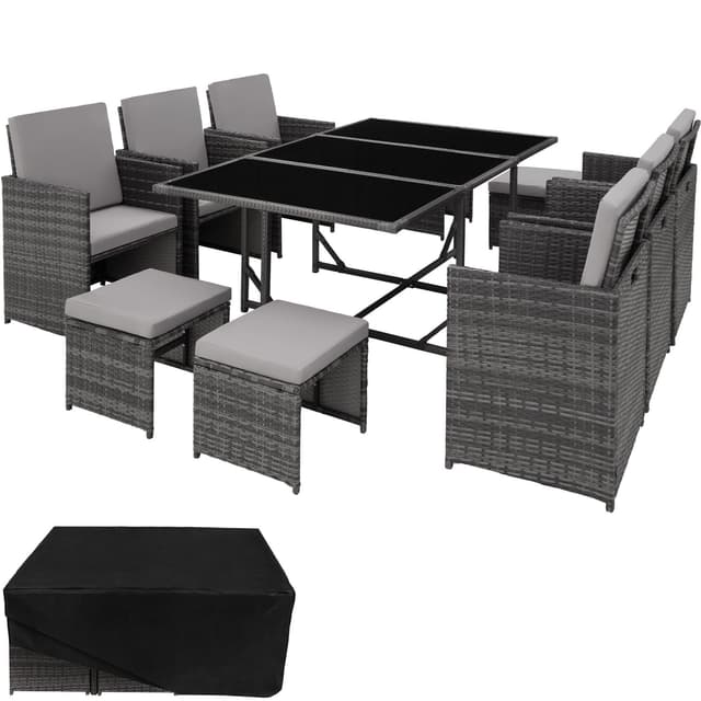 Vår matgrupp Malaga är gjord i hållbar och elegant konstrotting vilket är ett optimalt materialval för tillverkning trädgårdsmöbler. Den slitstarka loungegruppen är tvättbar, lätt att rengöra och väderbeständig, vilket gör den idealisk för utomhusbruk. De vadderade gräddfärgade kuddarna är vattenavvisande, och tack vare de isydda dragkedjorna kan överdragen enkelt tas av och rengöras. Den härdade glasskivan är svartmålad längst ned, vilket ger matgruppen en lyxig och stilren look. Trädgårdsfåtöljerna är utrustade med praktiska handtagsuttag på kanterna, vilket gör dem enkla att förflytta. De fällbara ryggstöden gör att både fåtöljerna och pallen kan staplas på ett platsbesparande sätt vilket gör förvaringen av utemöblerna enkel och effektiv. Det medföljande skyddsöverdraget ger extra skydd och förlänger trädgårdsmöblernas livslängd och gör att du kan njuta av din sittgrupp längre. Beställ din nya matgrupp Malaga idag och förvandla din trädgård till en oas av komfort och stil!