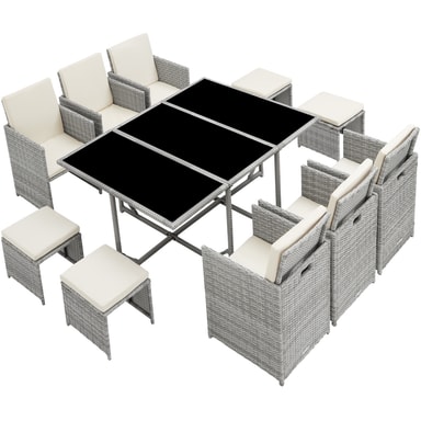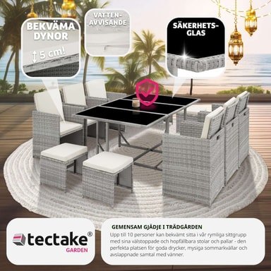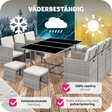 Vår matgrupp Malaga är gjord i hållbar och elegant konstrotting vilket är ett optimalt materialval för tillverkning trädgårdsmöbler. Den slitstarka loungegruppen är tvättbar, lätt att rengöra och väderbeständig, vilket gör den idealisk för utomhusbruk. De vadderade gräddfärgade kuddarna är vattenavvisande, och tack vare de isydda dragkedjorna kan överdragen enkelt tas av och rengöras. Den härdade glasskivan är svartmålad längst ned, vilket ger matgruppen en lyxig och stilren look. Trädgårdsfåtöljerna är utrustade med praktiska handtagsuttag på kanterna, vilket gör dem enkla att förflytta. De fällbara ryggstöden gör att både fåtöljerna och pallen kan staplas på ett platsbesparande sätt vilket gör förvaringen av utemöblerna enkel och effektiv. Det medföljande skyddsöverdraget ger extra skydd och förlänger trädgårdsmöblernas livslängd och gör att du kan njuta av din sittgrupp längre. Beställ din nya matgrupp Malaga idag och förvandla din trädgård till en oas av komfort och stil!