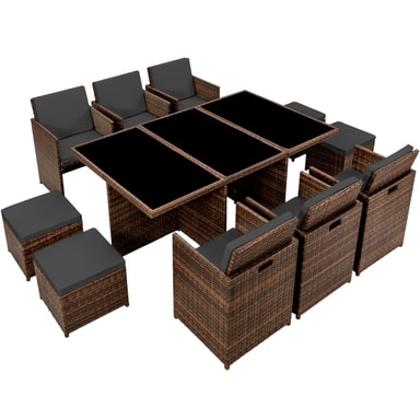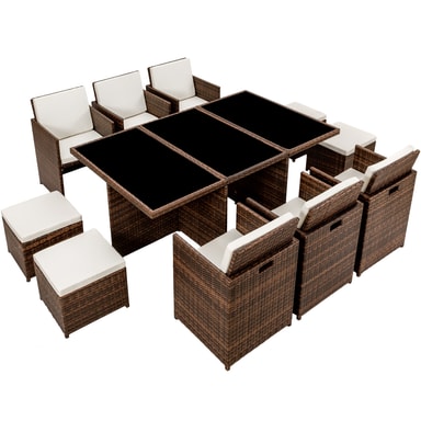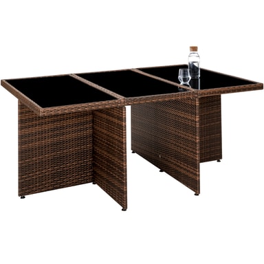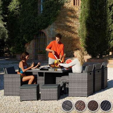 Matgrupp New York passar både i trädgården och inomhus. Våra sittmöbler i konstrotting är flexibelt användbara och ger din trädgård, terrass, uterum eller vardagsrum ett lyft. Bekväma stolar och det eleganta bordet bjuder in till trevliga stunder. Vår soffgrupp utmärker sig, inte bara genom sin attraktiva design utan även genom sin långa livslängd. Den låga vikten gör möblerna lätta att transportera. Bordsytan med 3 glassektioner är mycket elegant och extremt lätt att rengöra. De bekväma gräddfärgade sittkuddarna i polyester är väl färgkombinerade med rottingmöblerna och på baksidan har de ett blixtlås, för enkel rengöring av dynorna. För att skydda dynorna från genomfuktning, är ytan impregnerad. På så sätt rinner smuts och vattendroppar helt enkelt av. Få känslan av en pulserande huvudstad i ditt hem med vår matgrupp New York!