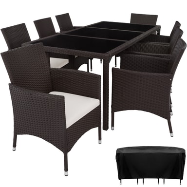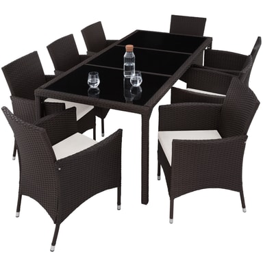 Matgrupp Valencia erbjuder bekväma stolar och elegant bord som garanterar sköna stunder. Detta rottingset lockar inte endast med sitt eleganta utseende, utan även med sin långa livslängd. Den låga vikten gör vår matgrupp smidig att transportera. Bordsytan med de 3 glaselementen ser exklusiv ut och är superenkel att rengöra. De mycket bekväma sittdynorna i gräddfärgad polyesterklädsel är färgmatchade med rottingmönstret och försedda med en dragkedja baktill, så att stoppningen går lätt att rengöra. Soffgrupp Valencias Yta är ompregnerad för att hålla stoppningen torr. Detta innebär att de är smuts- och vattenavvisande. Beställ din nya matgrupp från tectake.