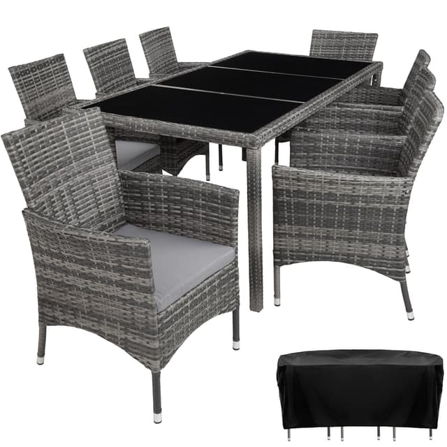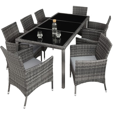 Matgrupp Valencia erbjuder bekväma stolar och elegant bord som garanterar sköna stunder. Detta rottingset lockar inte endast med sitt eleganta utseende, utan även med sin långa livslängd. Den låga vikten gör vår matgrupp smidig att transportera. Bordsytan med de 3 glaselementen ser exklusiv ut och är superenkel att rengöra. De mycket bekväma sittdynorna i gräddfärgad polyesterklädsel är färgmatchade med rottingmönstret och försedda med en dragkedja baktill, så att stoppningen går lätt att rengöra. Soffgrupp Valencias Yta är ompregnerad för att hålla stoppningen torr. Detta innebär att de är smuts- och vattenavvisande. Beställ din nya matgrupp från tectake.