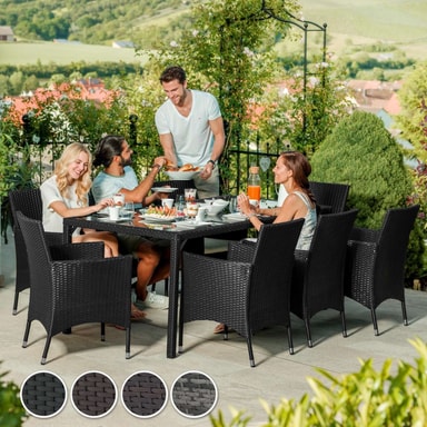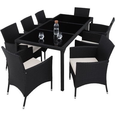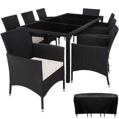 Matgrupp Valencia erbjuder bekväma stolar och elegant bord som garanterar sköna stunder. Detta rottingset lockar inte endast med sitt eleganta utseende, utan även med sin långa livslängd. Den låga vikten gör vår matgrupp smidig att transportera. Bordsytan med de 3 glaselementen ser exklusiv ut och är superenkel att rengöra. De mycket bekväma sittdynorna i gräddfärgad polyesterklädsel är färgmatchade med rottingmönstret och försedda med en dragkedja baktill, så att stoppningen går lätt att rengöra. Soffgrupp Valencias Yta är ompregnerad för att hålla stoppningen torr. Detta innebär att de är smuts- och vattenavvisande. Beställ din nya matgrupp från tectake.