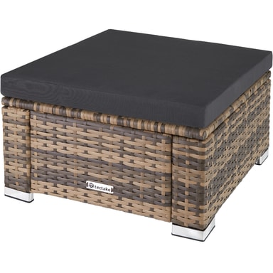 Denna pall från tectake har många funktioner: sittpall, fotpall, sidobord eller avlastningsbord? Oavsett vad du väljer att använda pallen till så går det inte att förneka att den är kvadratisk, praktisk, elegant: konstrotting-sittpallen från tectake är ett blickfång i din trädgård eller till din inredning balkongen. Pallen kan användas ensam eller som komplement till en befintligt rottinggrupp. Den lättskötta konstruktionen av skruvar av specialstål och konstrotting står emot både vind, sol och regn. Den stora, tjocka sittdynan matchar färgen på denna fotpall perfekt. Som skydd mot fukt är ytan impregnerad. Tack vare sin höjd passar denna stabila pall även utmärkt som avlastningsbord till att ställa drycker eller lägga böcker på och liknande. Unna dig avkoppling och lägg upp benen på den bekväma pall i konstrotting från tectake.