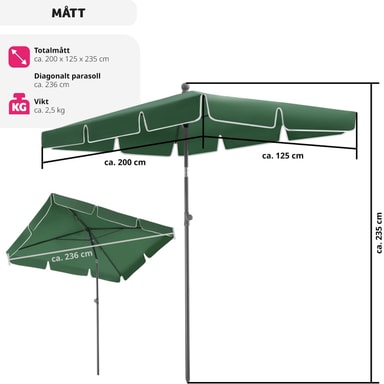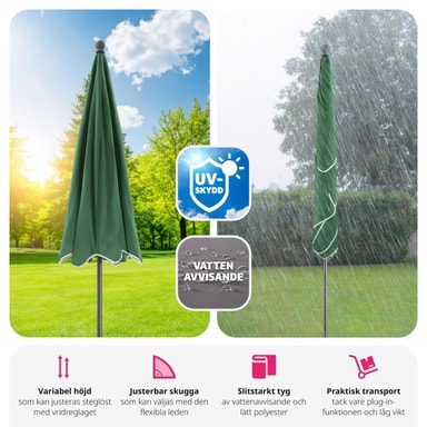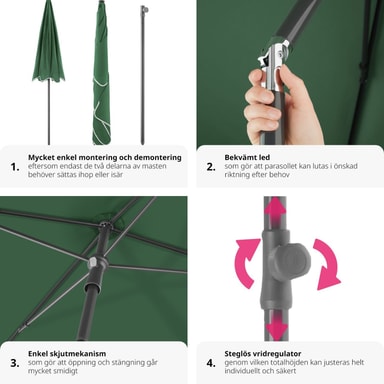 Parasollfot medföljer ej. Parasollet måste hållas stängt vid stark vind eller storm och eventuellt plockas undan helt.