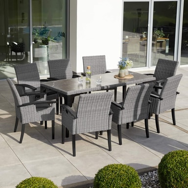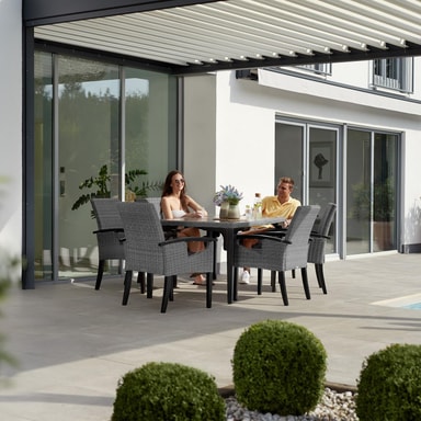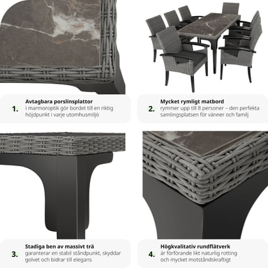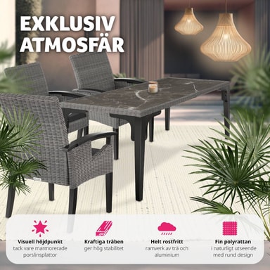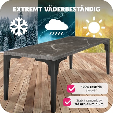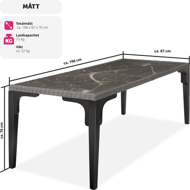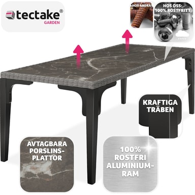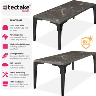 Det stora rottingbordet Foggia från tectake utgör en utmärkt mittpunkt för att umgås utomhus. De två solida plattorna av fint stengods med sin tilltalande marmorering är verkligen ett blickfång. Det högkvalitativa meshet och de robusta träbenen avrundar det eleganta utseendet på detta inbjudande matbord. Materialen som används gör den mångsidiga utemöbleln okänslig för yttre påverkan och garanterar en lång livslängd - njut av sommaren till fullo med det attraktiva trädgårdsbordet Foggia från tectake.