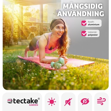 Aluminiumramen är rostfri och polyesterduken är väderbeständig. Den är både avskärmande och utdragbar, vilket ger utmärkt skydd mot sol och vind året runt.