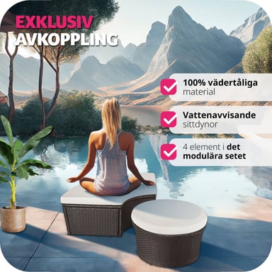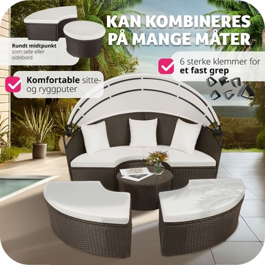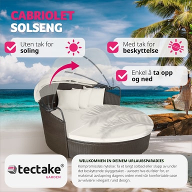 Med denna runda solsäng från tectake i aluminium och konstrotting förvandlar du din trädgård, terrass, vinterträdgård, balkong eller ditt hemma-spa till en härlig oas. Vid soliga dagar skänker solsängens uppfällbara solskyddstak angenäm skugga och skyddar mot vind. Denna solsäng kan användas som en bekväm dagbädd med sina fantastiak dynor, eller enkelt omvandlas till en praktisk sittgrupp med soffa, pallar och bord med plats för familj och vänner. Du kan lätt modifiera denna solsäng i konstrotting så att den passar dina behov – denna solsäng är ett absolut måste i ditt eget hemma-spa. Köp hem din nya solsäng från Tectake.