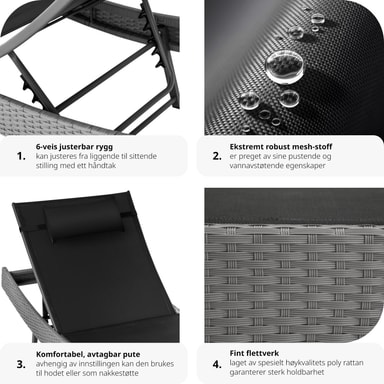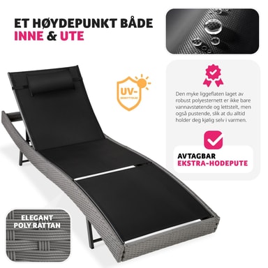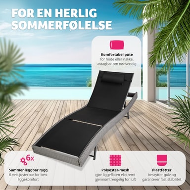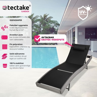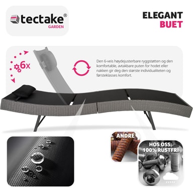 Njut av soliga dagar och total avkoppling med den mysiga solsängen Moana från tectake. Det 6-stegs justerbara ryggstödet, det svala meshtyget och den mjuka kudden säkerställer maximal komfort. Den fint flätade konstrottingen och den böljande designen ger den inbjudande trädgårdsstolen dess speciella utstrålning. Med sina flexibla och funktionella egenskaper erbjuder solstolen från tectake en kombination av avkoppling, hög stabilitet och lågt underhåll. De golvvänliga plastkåporna skyddar din yta och ger extra trygghet vid användning. Den bekväma solstolen från tectake är den perfekta möbeln för att skapa din egna oas av lugn och komfort. Lätt att underhålla och designad för utomhusbruk – din semester börjar här!
