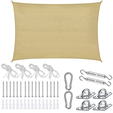Det andningsbara tyget av rivtåligt HDPE-material erbjuder inte bara ett effektivt UV-skydd, utan imponerar också med sin enorma motståndskraft mot vind och regn. De rostfria stålringen i ändarna är fast insydda och möjliggör en säker och stabil fastsättning. Oavsett om det är på träd, stolpar eller andra fasta punkter – tack vare det medföljande monteringsmaterialet med spännband, spännskruvar, väggfästen, karbinhakar, skruvar och pluggar går uppsättningen snabbt och enkelt.