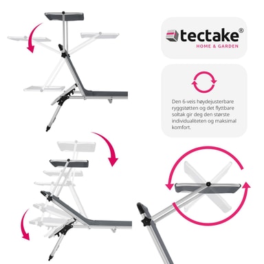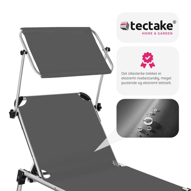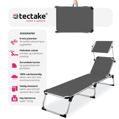 Denna snygga solsäng Aurelie från tectake erbjuder bästa komfort för härliga sommardagar i solen. Ryggstödet kan justeras i 6 lägen och det rörliga soltaket ger största individualitet och högsta bekvämlighet. Det väderresistenta textilöverdraget är extremt slitstarkt, mycket andningsaktivt och ytterst lättskött. Denna solsäng är utrustad med ett hopfällbart underrede som består av lätt och väderresistent aluminium - perfekt för transport och användning utomhus.