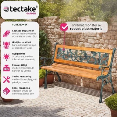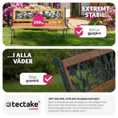 Oavsett om du placerar trädgårdsbänken Marina i trädgården eller framför huset - så kan denna bänk i trä och gjutjärn inte vara felplacerad. Denna otroligt bekväma och välgjorda trädgårdsbänk från tectake är en fröjd för ögat.