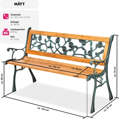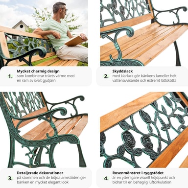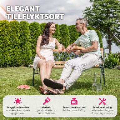 Ge din trädgård eller uteplats en elegant touch med våra utomhusbänkar i trä och gjutjärn - det perfekta valet för din utomhusmiljö!