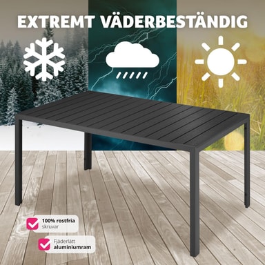 Detta moderna trädgårdsbord från tectake kännetecknas av sin eleganta form och rena linjer. Bordsskivan har tvärgående lameller med en träliknande finish som ger ett stilrent intryck. Trots ojämnt underlag står bordet stabilt, tack vare de höjdjusterbara fötterna. Den robusta aluminiumramen och den slitstarka plastskivan gör detta lätta trädgårdsbord till ett perfekt val för utomhusbruk.
