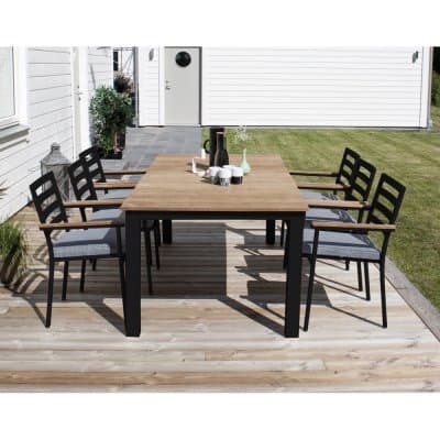 Här erbjuds en stomme av svart aluminium och toppskiva av det slittåliga, karaktärrika träslaget teak.