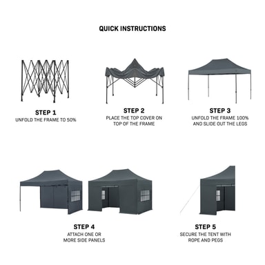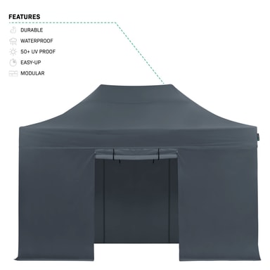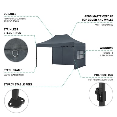 Tältet är tillverkat av slitstarkt 420D Oxford-tyg med PVC-beläggning, har UV-skydd 50+ och är vattentätt upp till 3000 PA. Den robusta stålramen och easy-up-systemet gör tältet enkelt att montera och smidigt att använda. Förvaringsväska med hjul ingår för enklare transport och förvaring.