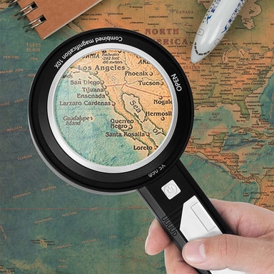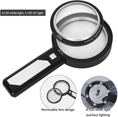 Ett förstoringsglas med förstklassig optisk glaslins och LED-lampor, perfekt för att kunna läsa lättare och se fina detaljer i böcker, tidningar och föremål och även vid dåliga ljusförhållanden. Du kan välja mellan 5x (1 lins) och 10x (2 linser) förstoring.