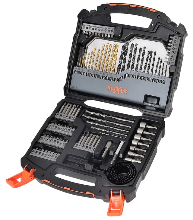 Borr- och bitssats med 99 delar. Borr: 13 st. HSS borr 5 st. betongborr 13 st. träborr 4 st. hålborr Bits i S2-stål: 1 st. 60 mm förlängningsstycke 1 st. 13 mm försänkare 4 st. 50 mm PH bits 3 st.50 mm Torx bits 10 st. 25 mm PH bits 10 st. 25 mm PZ